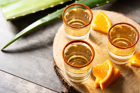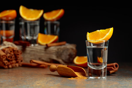 Tequila shots with orange and cinnamon on a rustic background. Copy space.