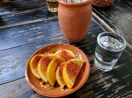 Image of a small glass of mezcal with a plate of orange slices with chili powder