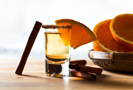 tequila with orange and cinnamon on a wooden table