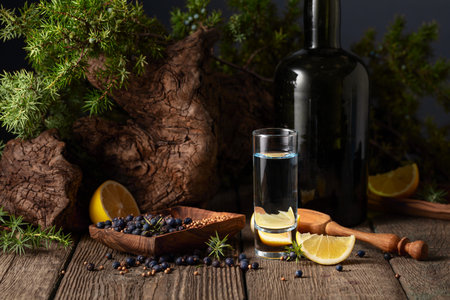 Blue gin and juniper branches on an old wooden table. Gin with ingredients - juniper berries, coriander seeds, and lemon slices.