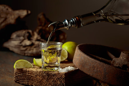 Tequila with salt and lime slices on a wooden board. Tequila is poured from a bottle into a glass. Vintage background with old wood and rusty metal.