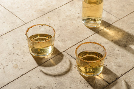Shot of tequila with salt and lemon and reflection on bright table.