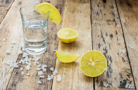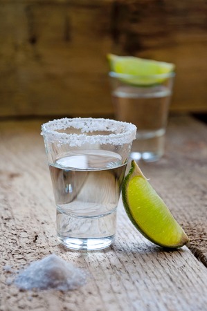 Alcohol Shot Drink. Silver Tequila with Lime and Salt on the Wooden Table.