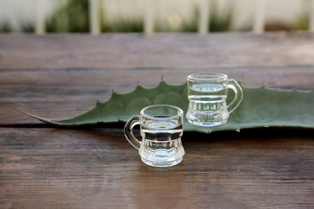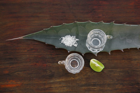 Mexican tequila shots and green leaves on wooden table. Drink made of agave