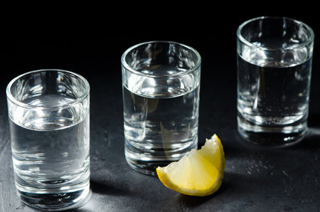 Three glasses of Russian vodka on a black concrete background. Piece of lemon.