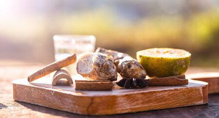 Mezcal Mexican drink with worm salt on wooden table