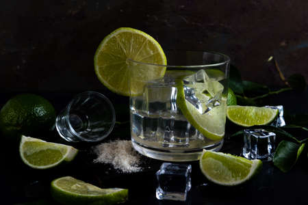 Tasty alcohol drink cocktail tequila with lime and salt on vibrant dark background. closeup.