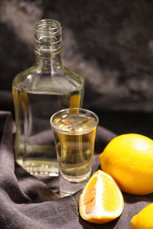 Bottle and shot of tasty tequila with lemon on dark background, closeup
