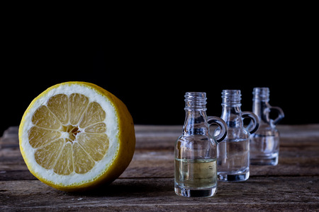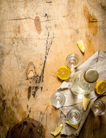 Vodka with lemon on wooden table background
