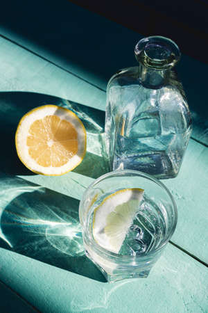 Water with lemon on a turquoise wooden background. Drink with vitamin C. Detox drink