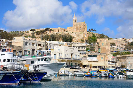 GHAJNSIELEM, MALTA - JUNE 15, 2018: Mgarr harbour with old fishing boats is surrounded by tall hills with residential cottages and Lourdes Chapel on the top, Gozo Island, on June 15 in Ghajnsielem.
