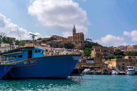 Mgarr, Gozo, Malta - September 3, 2019: Yachts, boats and ships anchored in yacht marina in Mgarr harbour, at Gozo island, Malta, with Lourdes Chapel and Ghajnsielem Parish Church on the hill.