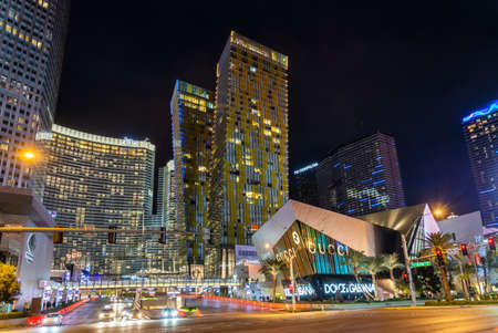 Las Vegas, Nevada, United States of America - January 10, 2017. Street view in Las Vegas, with modern buildings, commercial properties and city traffic, at night.