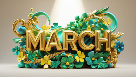 A 3D rendering of the word 'MARCH' in gold, surrounded by intricate floral elements in green, teal and yellow. The design conveys a sense of elegance and celebration of the spring season. Perfect for calendar, invitations or decoration.