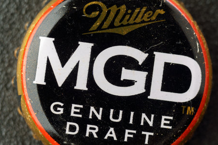 Tyumen, Russia-February 15, 2023: MGD logo retro cap on bottle close up. Miller Genuine Draft is the original draft beer, a product of the Miller.