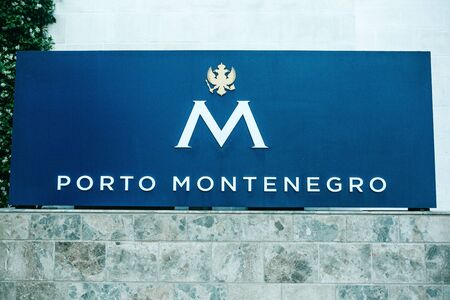 Montenegro, Tivat: August 18, 2019: Plate or inscription Porto Montenegro. This is a famous rich port in Montenegro with yachts.