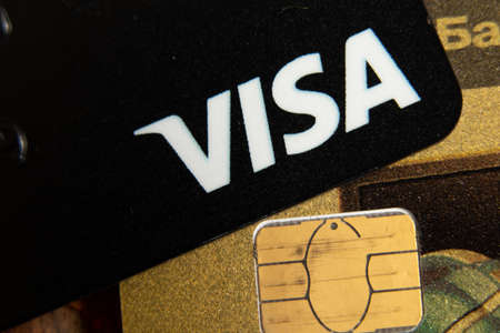 Ukraine Dnepr 01.04.2022 - Visa and Mastercard bank cards next to a macro photo, economic sanctions in Russia, default and crisis