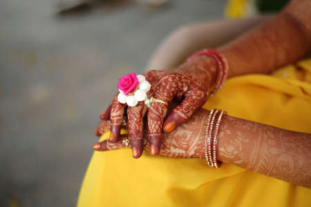 designing henna is applied to the hands of a hindu bride