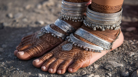 Close-up view of beautifully adorned feet with intricate mehndi designs and silver anklets, reflecting cultural artistry and tradition against a rustic background.