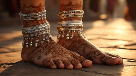 Close-up of beautifully decorated female feet featuring intricate henna designs and gleaming silver anklets, captured in a warm golden light during a cultural celebration.