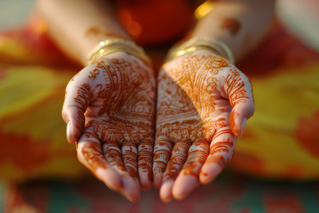 Close up view of a woman's hands adorned with intricate traditional henna tattoos, capturing the beauty and cultural significance of an Indian wedding ceremony