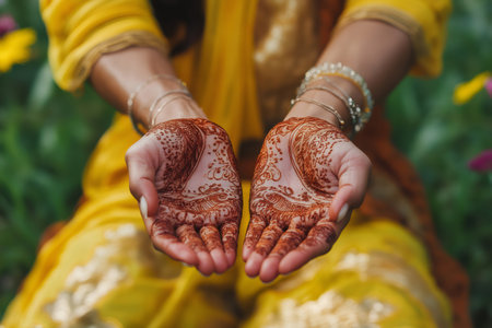 Delicate henna patterns embellish the hands of a bride, showcasing artistic detail and cultural significance during a wedding celebration outdoors.