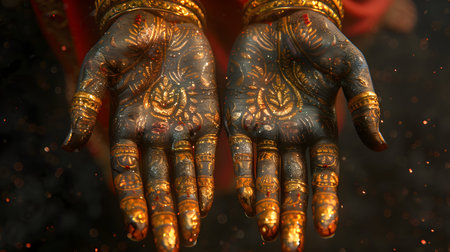 Intricate mehndi henna designs adorn hands, embellished with bright golden glitter. the traditional body art, popular in weddings and cultural festivals, showcases detailed patterns symbolizing beauty and celebrations. Generative AI