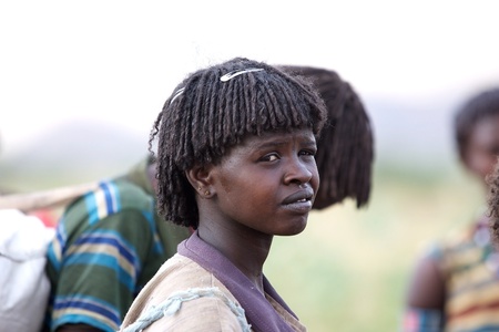 Turmi, Ethiopia, February 16, 2013: african woman of the Hamer ethnic group is showing the tribal hairstyle and necklaces at the jumping of the bull ceremony.