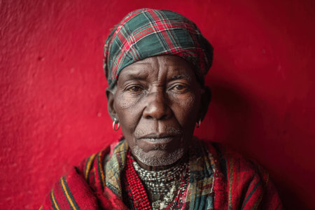 Senior woman in traditional clothing and jewelry, stands against a bold red backdrop, reflecting cultural identity and rich heritage in a captivating portrait