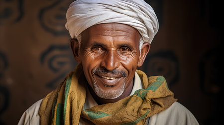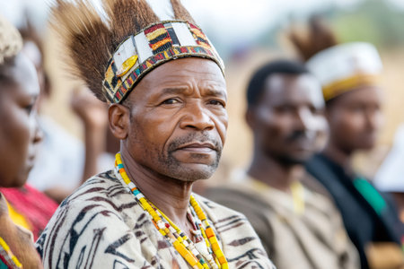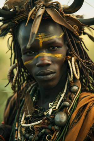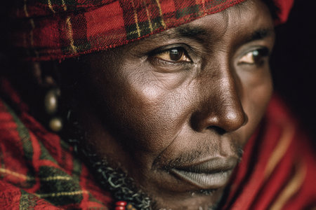 Close-up portrait of an African man in traditional attire, highlighting intricate facial features and vibrant patterns, capturing cultural identity and rich heritage