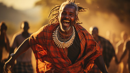 Portrait of happy African Maasai man with dreadlocks dancing.