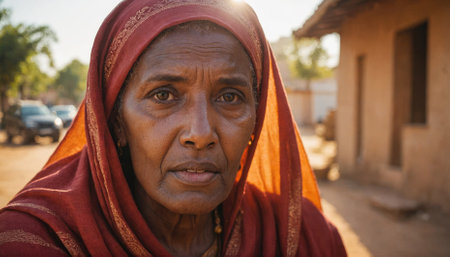 A woman wearing a red headscarf looks intently at the camera in a village setting