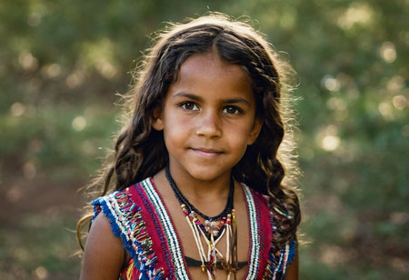 A young Aboriginal Australian girl stands confidently, adorned in traditional attire that showcases her rich cultural heritage.