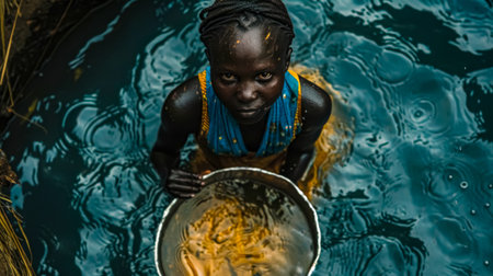 Young woman gathering water from a river