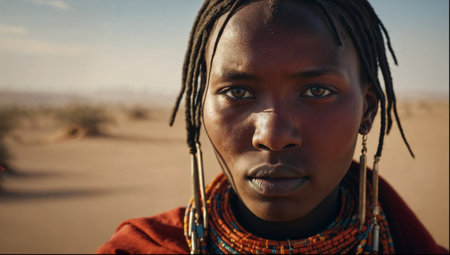 A close-up portrait of a proud Maasai man from Kenya, looking directly at the camera with a stoic and dignified expression.