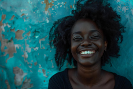 Beautiful young African woman smiling and keeping eyes closed while standing against brown background : Generative AI