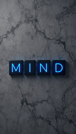 This image features blue neon letters spelling MIND against a textured marble background, evoking creativity and inspiration in a stylish and modern aesthetic.