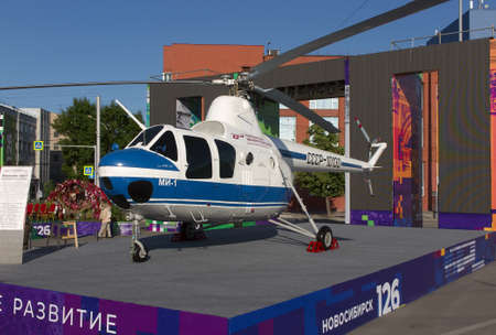 Novosibirsk, Siberia, Russia, 06.05.2019. Small helicopter on the exhibition podium before the Day of the city, surrounded by landscapes and buildings. Soviet technique