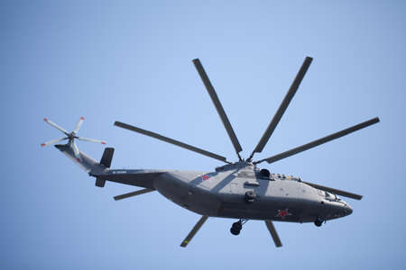 Moscow, Russia - May 7, 2021: Flying helicopters at rehearsal for The Victory Day military parade on May 9.