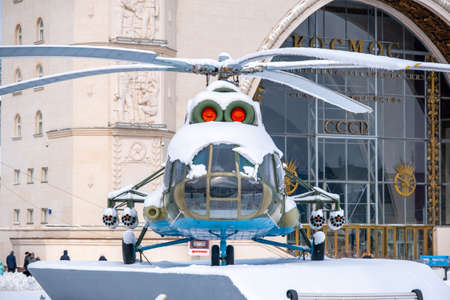 Moscow, Russia - April 4, 2022: View of the Vostok space rocket with a new attraction - a tubing slide, in the historical park at VDNKh in the winter and snow , Moscow, Russia