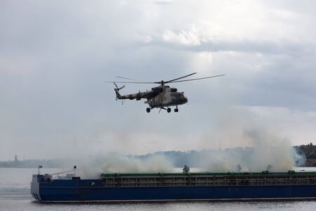 Tyumen, Russia - August 4, 2017: International Army Games. Engineering Formula contest. Military helicopter MI-8