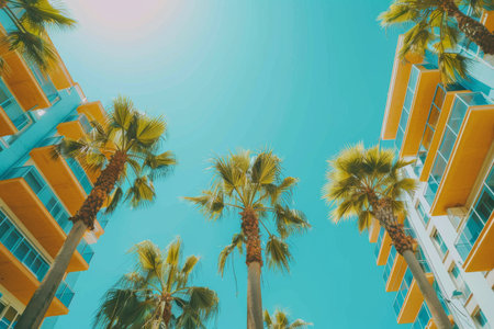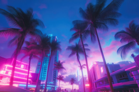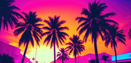 A retro-styled image showcases a coastal city skyline at sunset. Skyscrapers stand tall against a backdrop of a large sun, with palm trees framing the scene. The color palette features a mix of pinks, oranges, and blues, creating a stylized aesthetic suitable for various design projects.