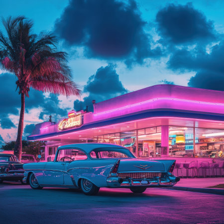 Classic American cars from the 1950s are parked outside a retro diner illuminated by vibrant neon lights during twilight hours.