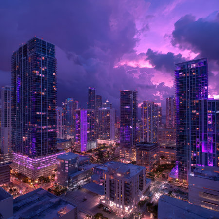 A vibrant cityscape showcases numerous illuminated skyscrapers under a dramatic sky. The scene features various buildings with purple lighting, creating a striking contrast against the dark sky. This composition utilizes a high-angle perspective, possibly suitable for architectural, travel, and editorial projects.