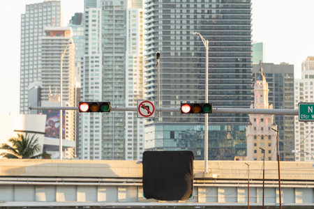 Highway or roadway with cars and skyline of miami, usa. Road with traffic signs for transport vehicles and palm trees on cloudy blue sky. Public infrastructure concept. Travelling by car.