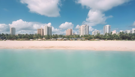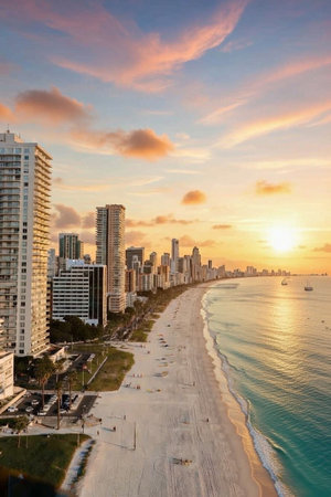 AI-generated Aerial view capturing a dense coastal city skyline lining a vast white sand beach, reflecting the dramatic golden sunset and pink clouds over the calm