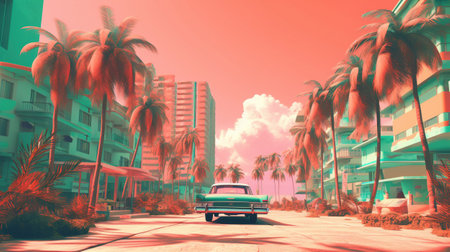 Generative AI, Miami Summer Vibes retro illustration. Vintage pink and blue colors, buildings, California palms, 80s style