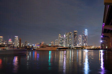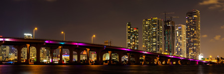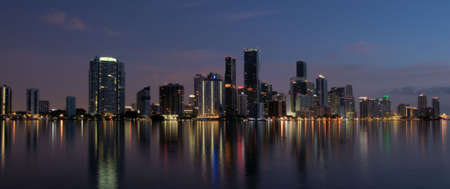 Miami night downtown. Skyline city miami lighting lights sea ocean sunset night cityscape buildings downtown, architecture skyscraper dusk panorama.