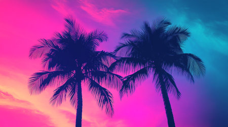 A stunning night scene featuring palm trees silhouetted against a backdrop of a colorful sky with multiple moons. The scene is illuminated with neon lights.