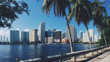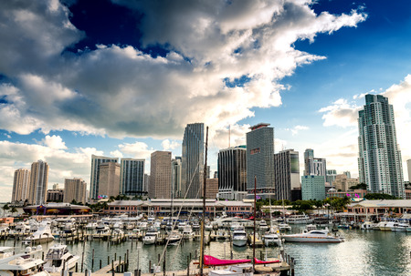 Beautiful Miami panorama skyline along Biscayne Bay with tall Brickell Avenue condos